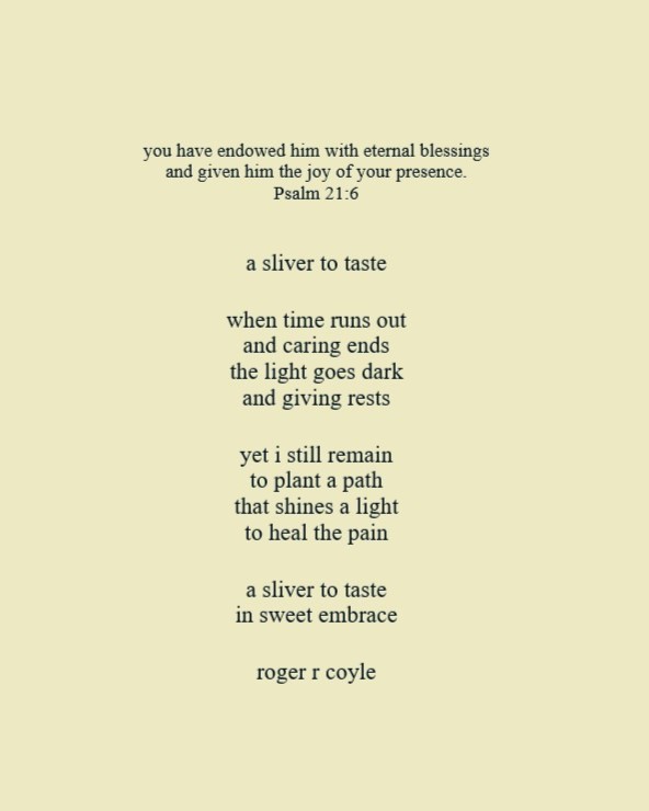 Some call me son, brother, godfather, cousin, uncle, writer, author, veteran, and friend. That may be true, but mostly I am me - a unique human being who has run the race of life through many different forests, down many roaring rivers and along some tangled paths. All in all it has been a good journey of growth and expansion of self. I am a lover of family, animals, food, laughs, poetry, books, compassionate people and chasing the light. My first journey into writing is Quiet Thoughts: Written Reflections. It is a book of poems and reflections - a small flicker of light into my life journey. I currently reside in Emmaus, PA and enjoy all that the Lehigh Valley has to offer. View all posts by rogerrcoyle