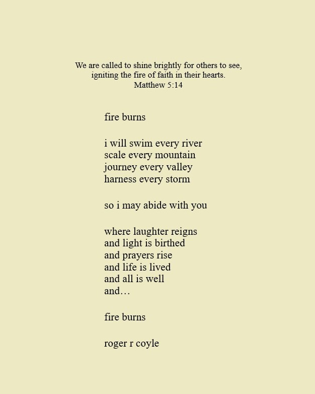 Some call me son, brother, godfather, cousin, uncle, writer, author, veteran, and friend. That may be true, but mostly I am me - a unique human being who has run the race of life through many different forests, down many roaring rivers and along some tangled paths. All in all it has been a good journey of growth and expansion of self. I am a lover of family, animals, food, laughs, poetry, books, compassionate people and chasing the light. My first journey into writing is Quiet Thoughts: Written Reflections. It is a book of poems and reflections - a small flicker of light into my life journey. I currently reside in Emmaus, PA and enjoy all that the Lehigh Valley has to offer. View all posts by rogerrcoyle