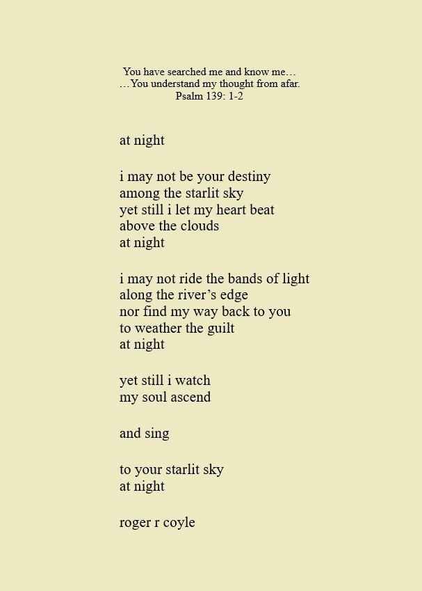 Some call me son, brother, godfather, cousin, uncle, writer, author, veteran, and friend. That may be true, but mostly I am me - a unique human being who has run the race of life through many different forests, down many roaring rivers and along some tangled paths. All in all it has been a good journey of growth and expansion of self. I am a lover of family, animals, food, laughs, poetry, books, compassionate people and chasing the light. My first journey into writing is Quiet Thoughts: Written Reflections. It is a book of poems and reflections - a small flicker of light into my life journey. I currently reside in Emmaus, PA and enjoy all that the Lehigh Valley has to offer. View all posts by rogerrcoyle