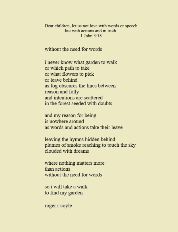 Some call me son, brother, godfather, cousin, uncle, writer, author, veteran, and friend. That may be true, but mostly I am me - a unique human being who has run the race of life through many different forests, down many roaring rivers and along some tangled paths. All in all it has been a good journey of growth and expansion of self. I am a lover of family, animals, food, laughs, poetry, books, compassionate people and chasing the light. My first journey into writing is Quiet Thoughts: Written Reflections. It is a book of poems and reflections - a small flicker of light into my life journey. I currently reside in Emmaus, PA and enjoy all that the Lehigh Valley has to offer. View all posts by rogerrcoyle