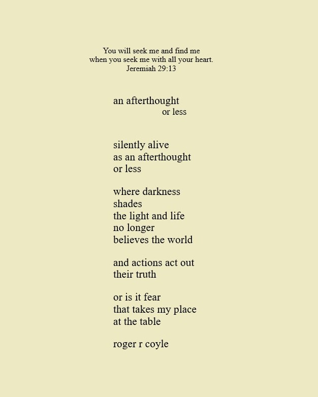 Some call me son, brother, godfather, cousin, uncle, writer, author, veteran, and friend. That may be true, but mostly I am me - a unique human being who has run the race of life through many different forests, down many roaring rivers and along some tangled paths. All in all it has been a good journey of growth and expansion of self. I am a lover of family, animals, food, laughs, poetry, books, compassionate people and chasing the light. My first journey into writing is Quiet Thoughts: Written Reflections. It is a book of poems and reflections - a small flicker of light into my life journey. I currently reside in Emmaus, PA and enjoy all that the Lehigh Valley has to offer. View all posts by rogerrcoyle