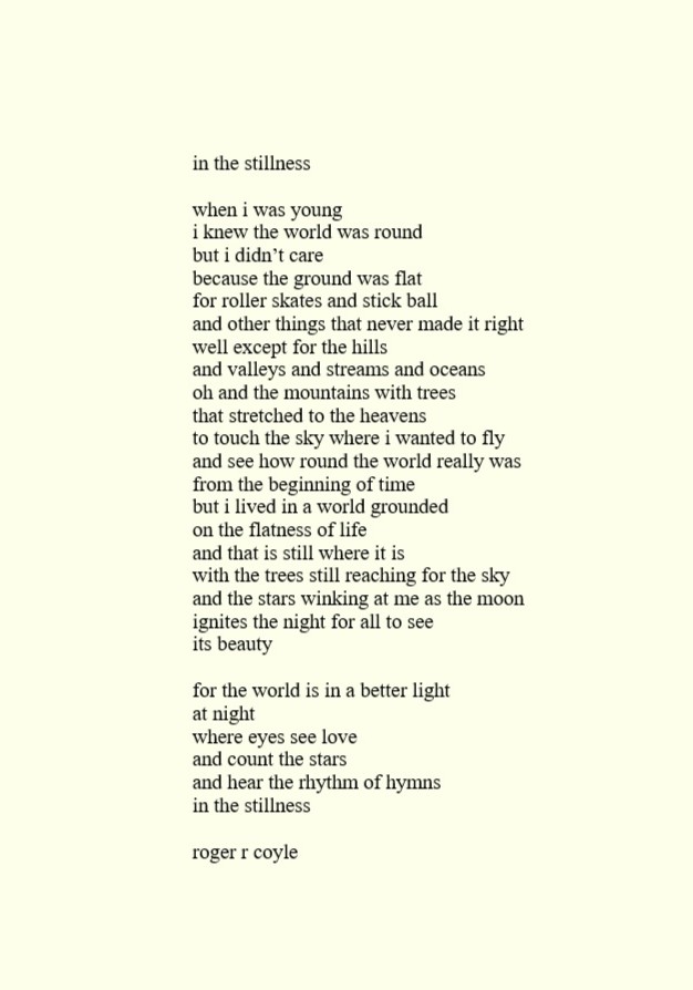 Some call me son, brother, godfather, cousin, uncle, writer, author, veteran, and friend. That may be true, but mostly I am me - a unique human being who has run the race of life through many different forests, down many roaring rivers and along some tangled paths. All in all it has been a good journey of growth and expansion of self. I am a lover of family, animals, food, laughs, poetry, books, compassionate people and chasing the light. My first journey into writing is Quiet Thoughts: Written Reflections. It is a book of poems and reflections - a small flicker of light into my life journey. I currently reside in Emmaus, PA and enjoy all that the Lehigh Valley has to offer. View all posts by rogerrcoyle
