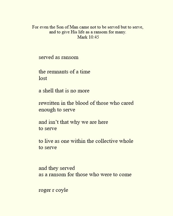 Some call me son, brother, godfather, cousin, uncle, writer, author, veteran, and friend. That may be true, but mostly I am me - a unique human being who has run the race of life through many different forests, down many roaring rivers and along some tangled paths. All in all it has been a good journey of growth and expansion of self. I am a lover of family, animals, food, laughs, poetry, books, compassionate people and chasing the light. My first journey into writing is Quiet Thoughts: Written Reflections. It is a book of poems and reflections - a small flicker of light into my life journey. I currently reside in Emmaus, PA and enjoy all that the Lehigh Valley has to offer. View all posts by rogerrcoyle