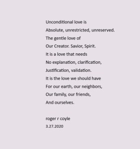 Some call me son, brother, godfather, cousin, uncle, writer, author, veteran, and friend. That may be true, but mostly I am me - a unique human being who has run the race of life through many different forests, down many roaring rivers and along some tangled paths. All in all it has been a good journey of growth and expansion of self. I am a lover of family, animals, food, laughs, poetry, books, compassionate people and chasing the light. My first journey into writing is Quiet Thoughts: Written Reflections. It is a book of poems and reflections - a small flicker of light into my life journey. I currently reside in Emmaus, PA and enjoy all that the Lehigh Valley has to offer. View all posts by rogerrcoyle